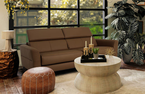 Elena brown Leather Loveseat Sofa Bed with adjustable headrests and dimensions 75.5" x 40.5" x 43.7".