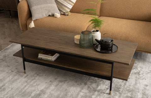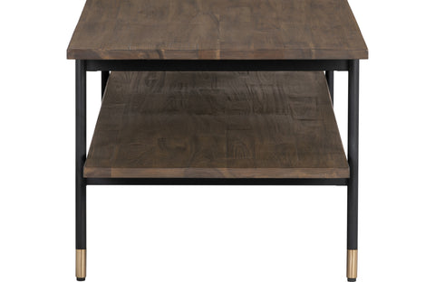 Experience the Features in MotionSublimez votre espace de vie avec cette longue table basse discrète alliant chaleur rustique et style industriel. Son plateau en chêne plaqué acacia est élégant, tandis que ses élégants pieds en métal noir, ornés de subtils embouts en laiton, lui confèrent une touche d'élégance moderne. Idéale pour les espaces de vie ouverts ou les intérieurs minimalistes, elle offre deux surfaces d'exposition et de rangement.