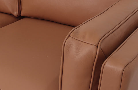 Close-up of Selina Midcentury Brown Leather Loveseat Sofa showcasing soft leather cushions and structured armrest.