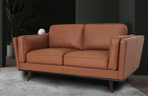 Selina Midcentury Brown Leather Loveseat Sofa featuring soft leather and structured design for contemporary living spaces.